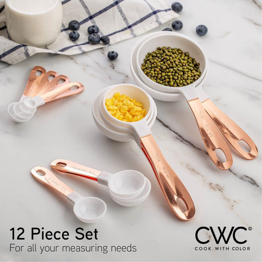 12 PC Measuring Cups Set and Measuring Spoon Set with Copper Coated Stainless Steel Handles, Nesting Kitchen Measuring Set, Liquid Measuring Cup Set, Dry Measuring Cup Set (White)